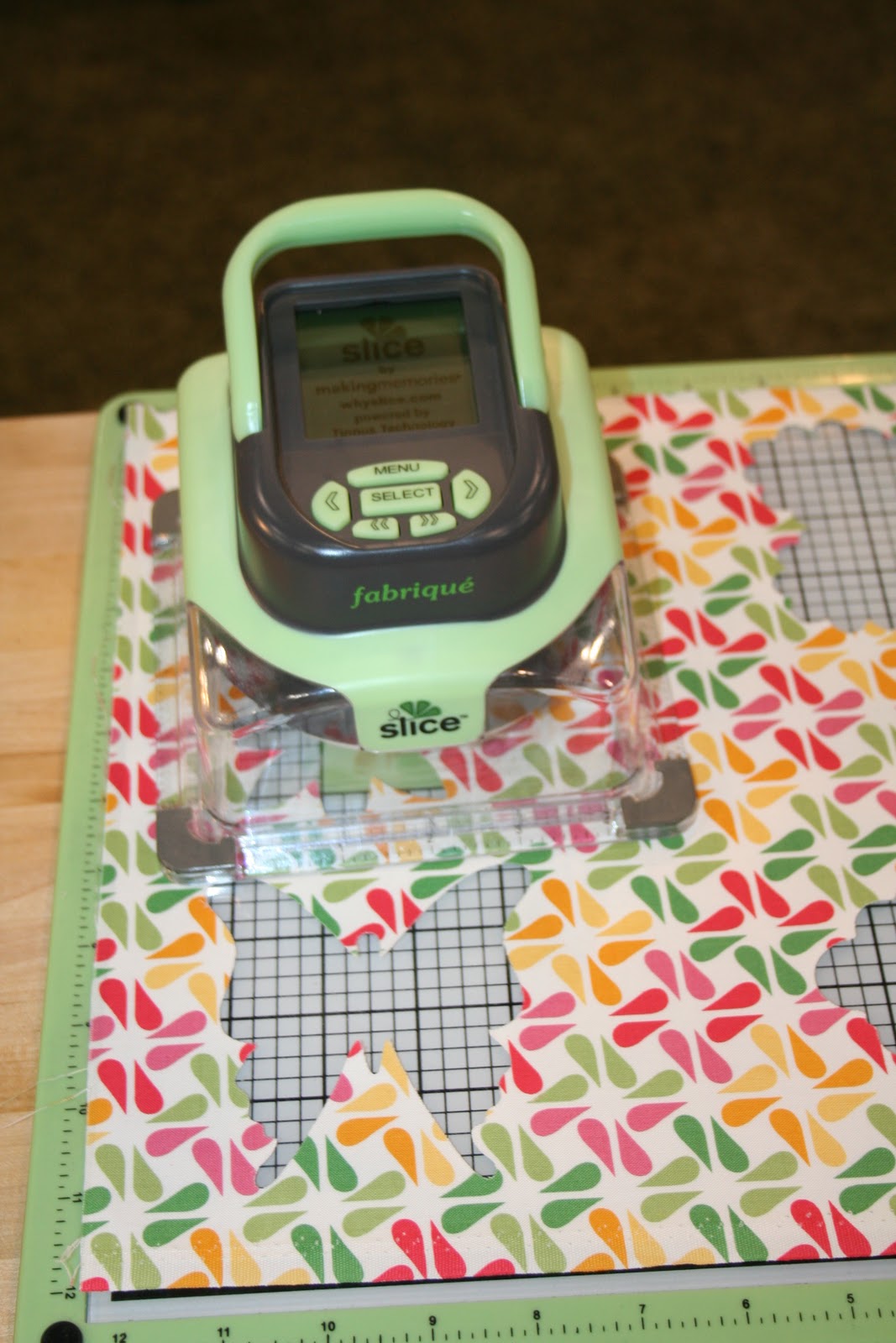 This is a photo I took in Houston at Quilt Market. As you can see it cuts nice and clean. You can make appliques between 1 and 4 inches in 1/2 inch increments. Some designs are 2-4 inches in 1/2 inch increments. The Slice Fabrique cuts one layer of fabric at a time. All of the Slice Design Cards (Slice Fabrique and Slice) work in the Slice Fabrique however you need to be aware that many of the Slice Design Cards were made for paper and some of the designs are too intricate for fabric. The Slice Fabrique comes with a One Year Limited Warranty. Making Memories handles all of the Warranty issues which is great because you don't have to return it to the place of purchase....just to Making Memories. The Slice Fabrique is an excellent choice for those people who want a larger variety of shapes and who want a variety of fonts for letters. Keep in mind that it cuts one layer of fabric at a time.